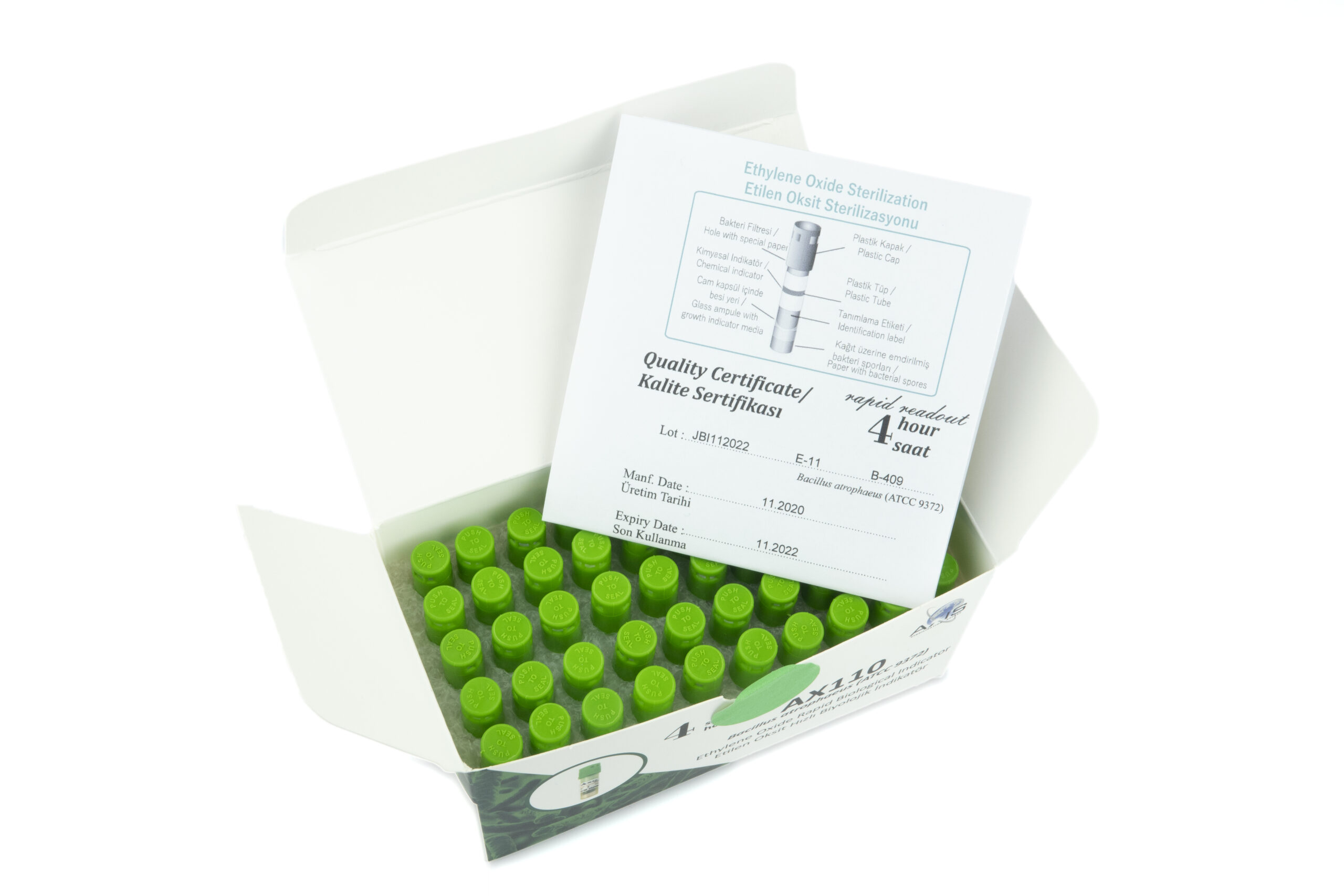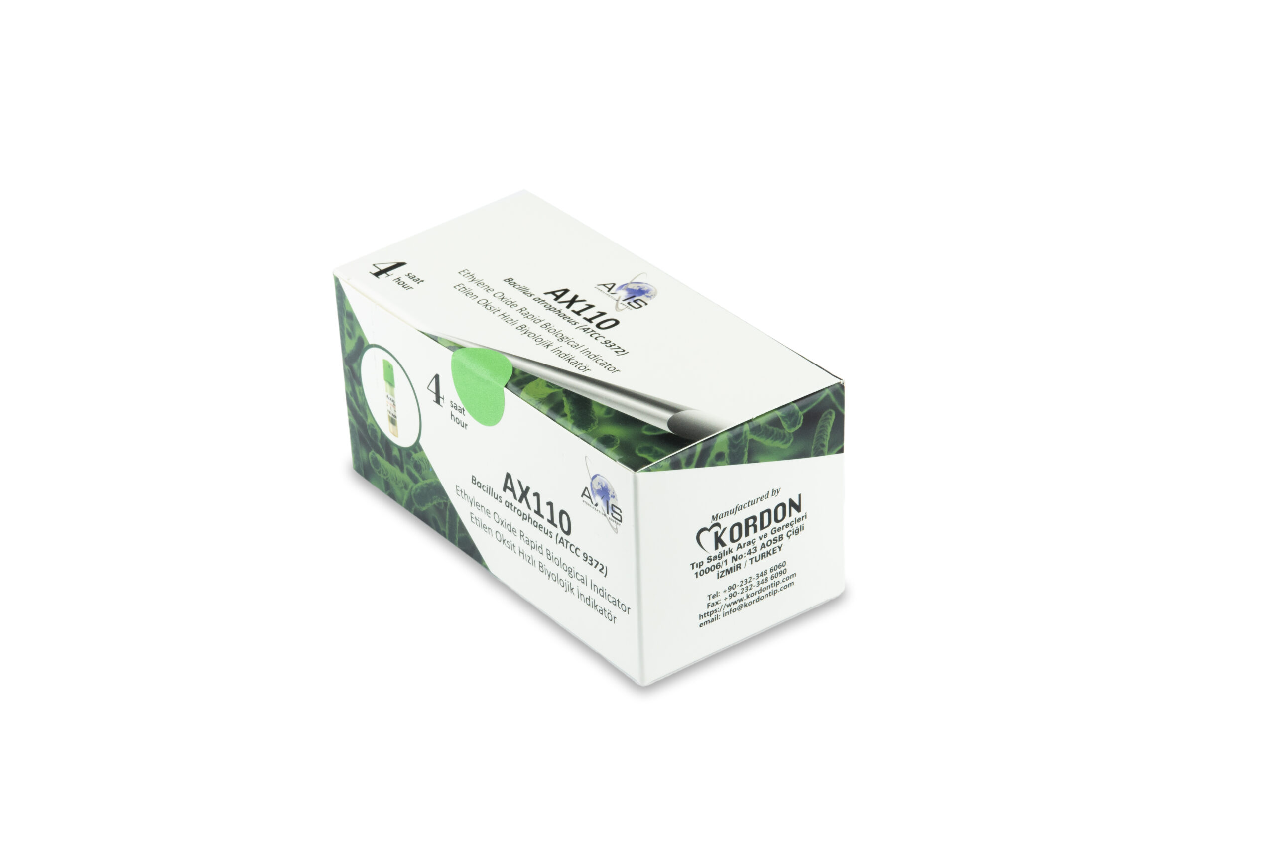AXIS Biological indicators for Ethylene Oxide sterilization typically contain spores of Bacillus atrophaeus, which are highly resistant to EO. After exposure to EO, the BIs are incubated under suitable conditions to check for spore growth. Lack of growth indicates effective sterilization.