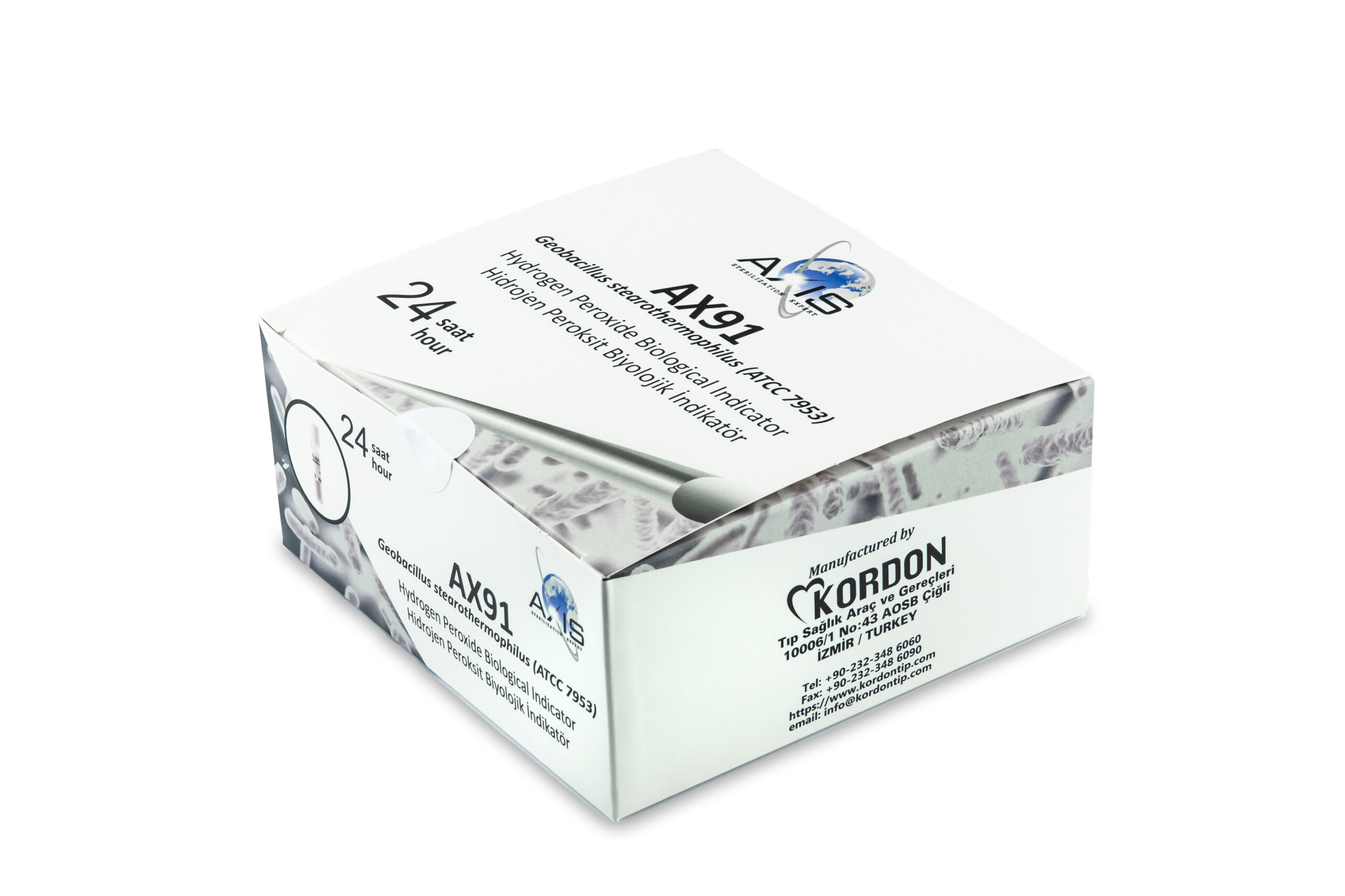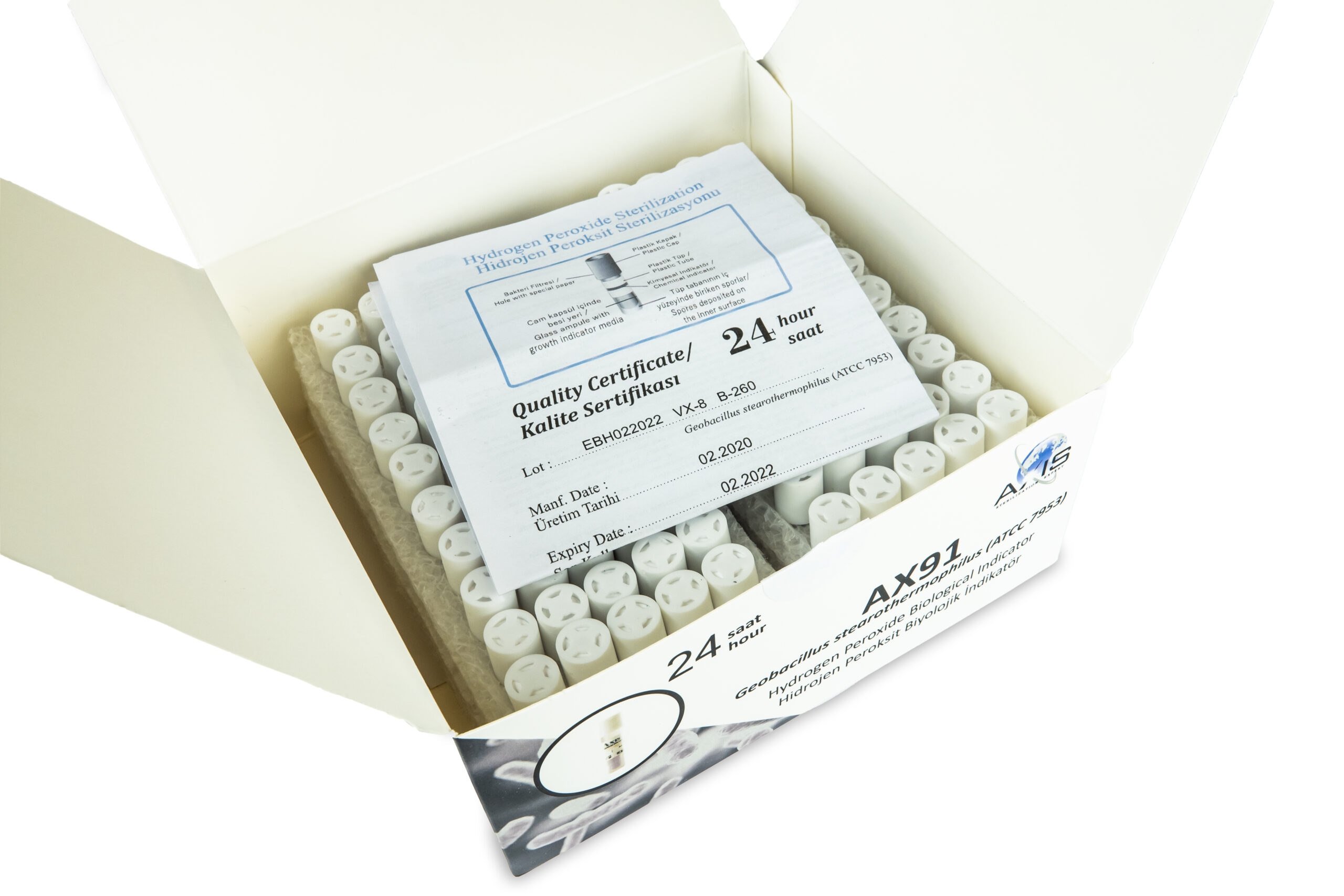 AXIS Biological indicators for Hydrogen Peroxide sterilization may contain spores of Geobacillus stearothermophilus. After exposure to the plasma, the BIs are incubated as usual to assess microbial growth, with the absence of growth indicating successful sterilization.